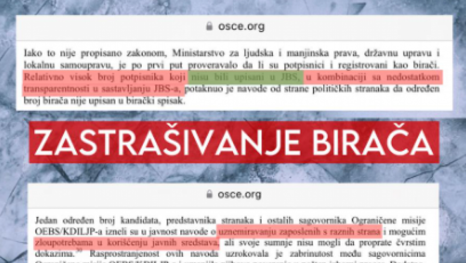 Vlast je, štaviše, na sve moguće načine pokušala da spreči bilo kakvu kontrolu izbornog procesa od strane nezavisnih posmatrača. ODIHR je u izveštaju naveo i da je vlast tokom kampanje zastrašivala birače i zloupotrebljavala sredstva iz državnog budžeta, dakle novac svih građana Srbije.