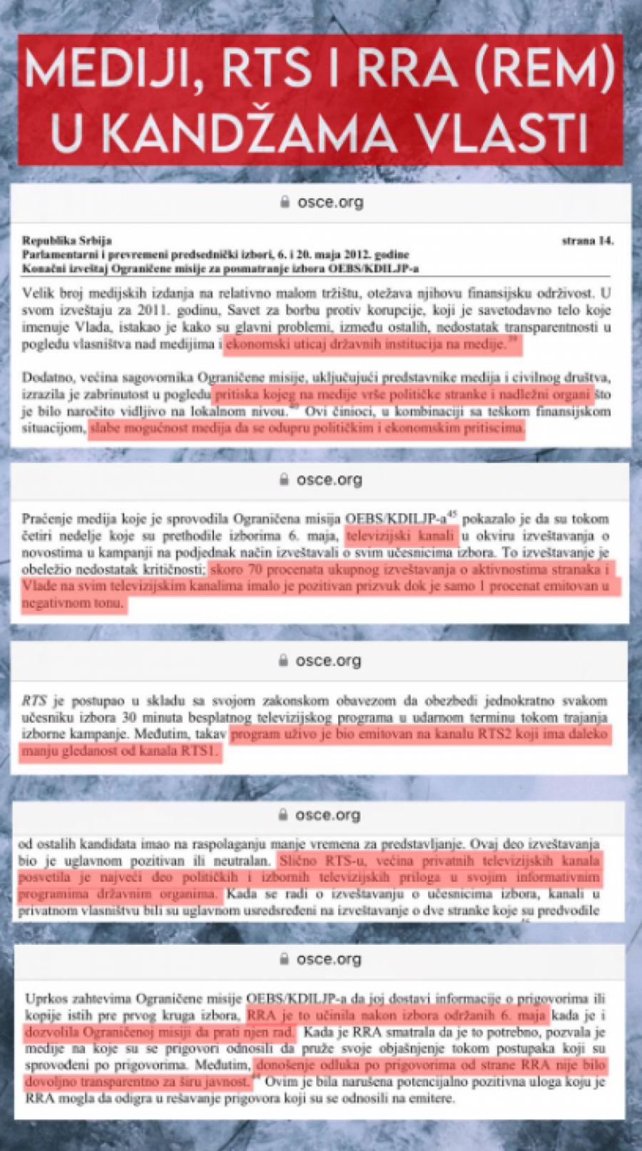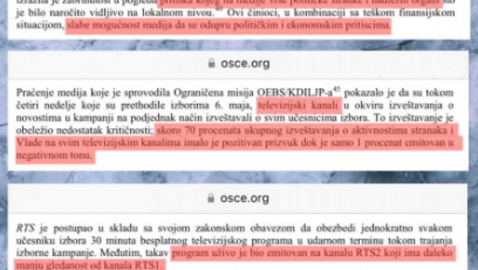 Kada je reč o medijima, ODIHR je konstatovao da su javni servis RTS, privatni mediji i RRA (današnji REM) bili pod apsolutnom kontrolom Đilasovog režima, zahvaljujući ekonomskim pritiscima vlasti na medije. To je rezultiralo činjenicom da je čak 70 odsto izveštaja o aktivnostima vlasti bilo pozitivno, a samo jedan odsto negativno! Takođe, vlast je ODIHR-u i ovde onemogućila da obavi svoj zadatak, jer RRA nije dozvolio posmatračima da prate njihov rad tokom kampanje i imaju uvid u prigovore na izveštavanje medija.