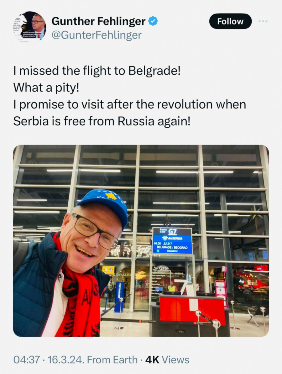 Podsećamo, Felinger je ne tako davno, takođe u objavi na X-u, tražio od NATO pakta da "bombarduje Beograd sada".