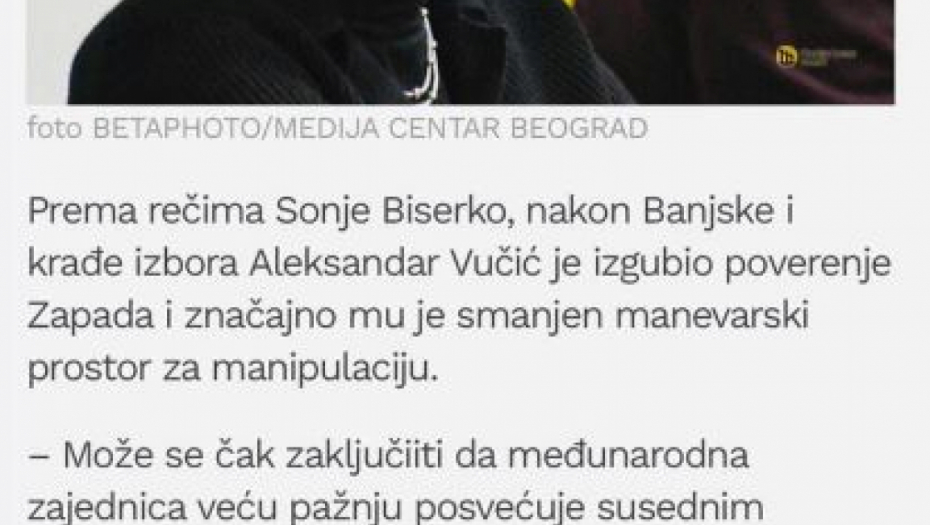 Biserko tako tvrdi da je "predsednik Vučić nakon Banjske i krađe izbora izgubio poverenje Zapada", zbog čega mu je smanjen manevarski prostor.