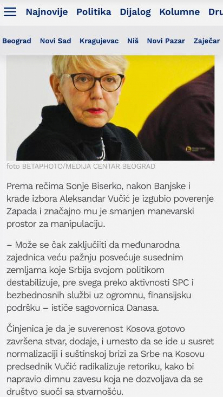Citiraju i izjavu Biserko koja je rekla da je "činjenica da je nezavisnost Kosova završena stvar".
