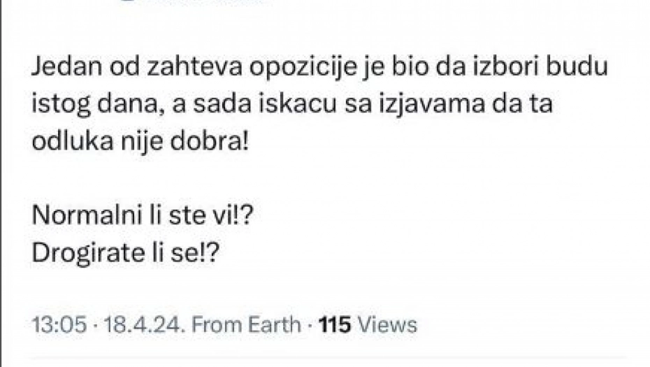 - Jedan od zahteva opozicije je bio da izbori budu istog dana, a sada iskaču sa izjavama da ta odluka nije dobra! Normalni ste li vi? Drogirate li se - upitao je tviteraš opoziciju.