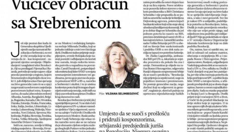 U današnjem sarajevskom Oslobođenju objavljen je skandalozan tekst Vildane Selimbegović, koja optužuje Vučića jer se suprotstavlja zlu protiv srpskog naroda.