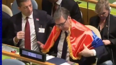 Naime, Vučić se ogrnuo zastavom Srbije u sali uprkos protivljenju predsenika Generalne skupštine UN i zahteva obezbeđenja da je skine.