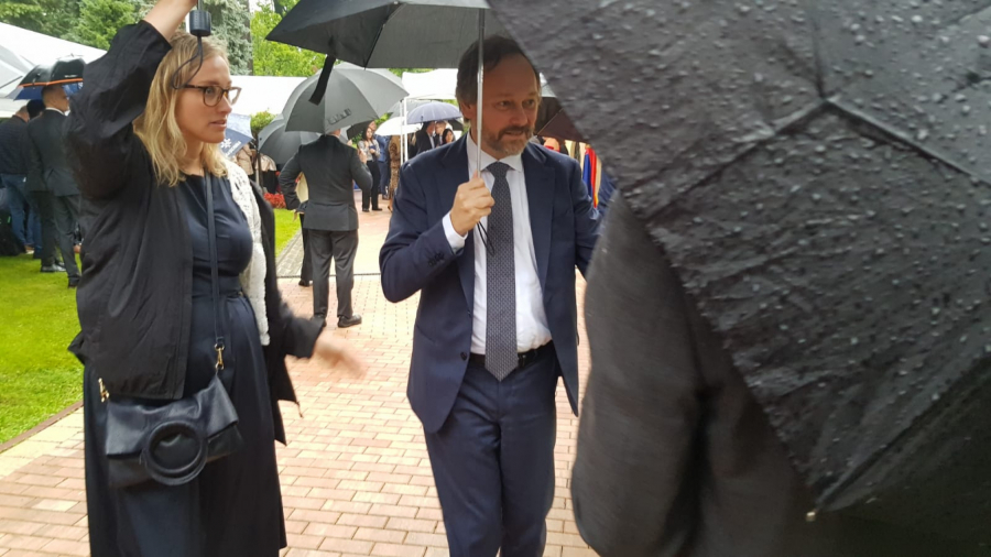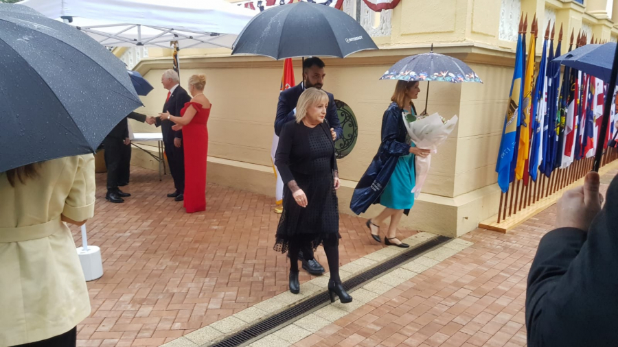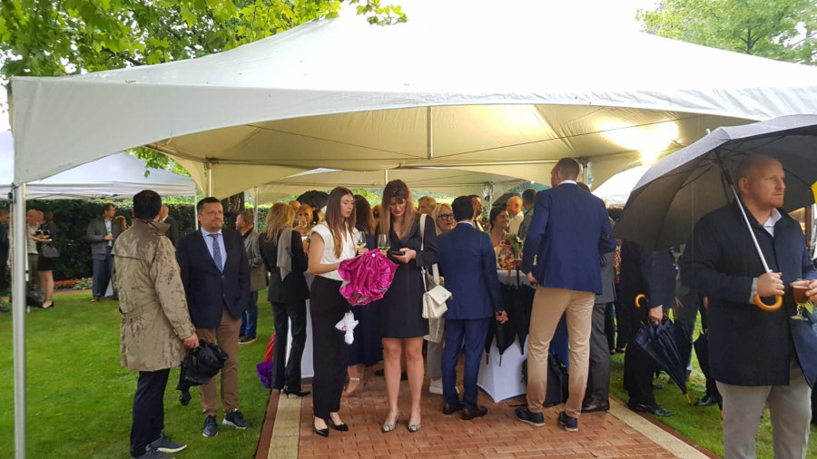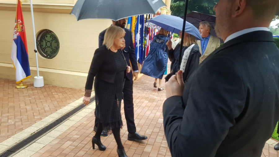 Zvanice u ambasadi, kako javlja naša reporteka sa terena, dočekao je Kristofer Hil u pratnji svoje supruge, koja je svojom odevnom kombinacijom prkosila kiši i tmurnom vremenu.