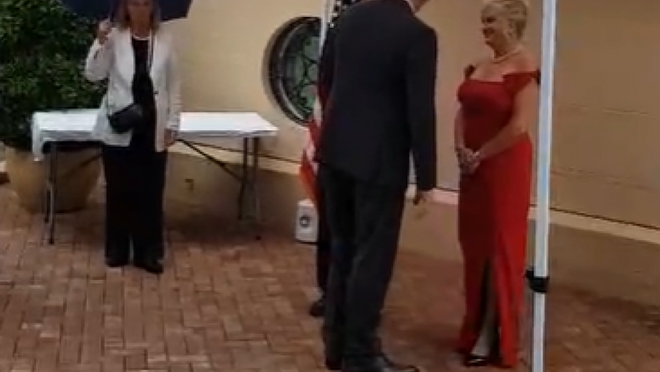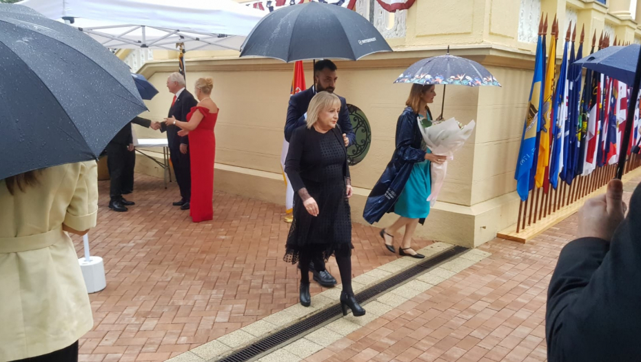 Nas predsednik ima veliku čast i zadovoljstvo da prisustvuje svečanom prijemu u ambasadi SAD i da svojim prisustvom uveliča njihovo slavlje. A njigovo slavlje ni kiša nece pokvariti.