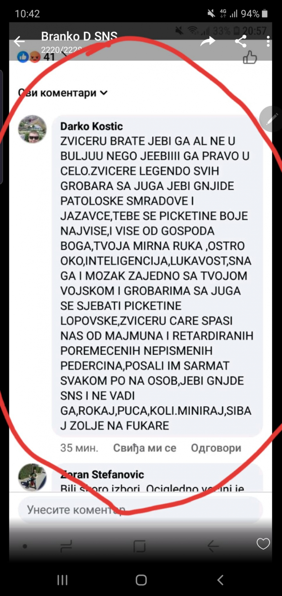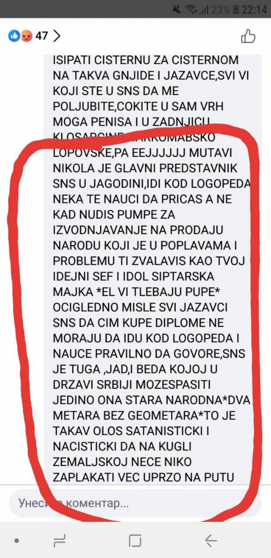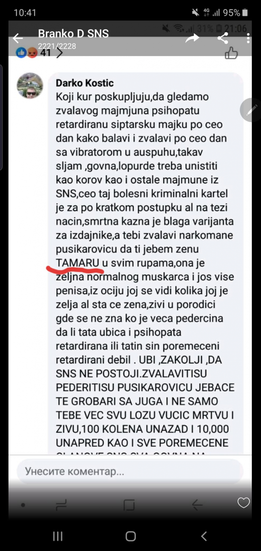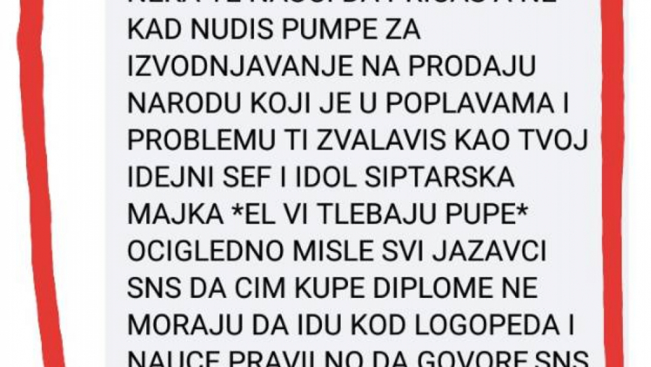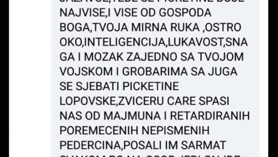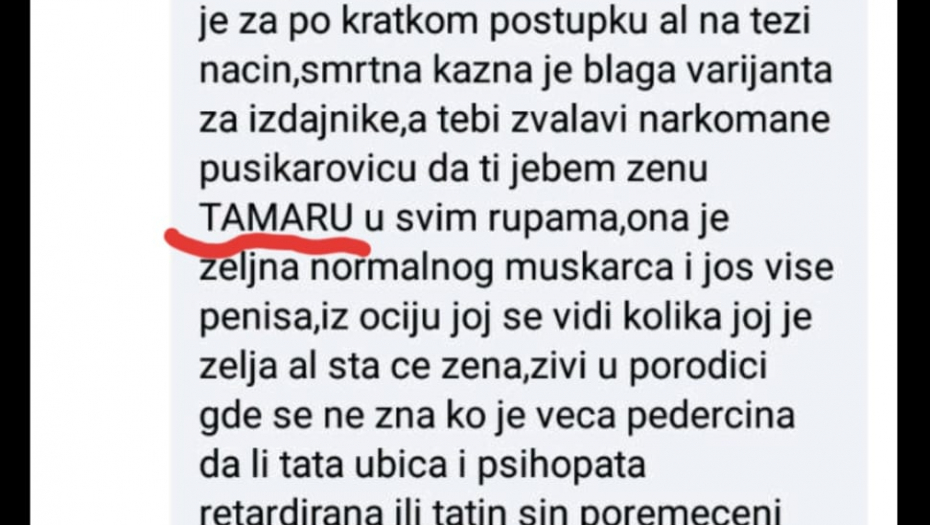 On u svojim komentarima pominje i Banjicu i Jajince, oca, kao i na najgori mogući način psuje sve najmrtvije, mrtvo i živo, a odnosi se na predsednika Srbije. Čak u tekstu pominje i Tamaru suprugu predsednika rečnikom gde ni jedan normalan čovek ne može ni da pomisli, a kamoli napiše, pozivajući na silovanje, kao i predsednika GrO SNS Jagodina Nikolu Radosavljevića gde kaže da za njega važi ona narodna : " dva metra bez geometra" gde poziva i na njegovo ubistvo. Ovakve objave samo nenormalni ljudi bez imalo savesti i morala mogu da objavljuju i ujedno podržavaju.