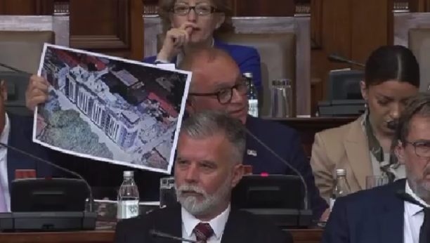 S tim u vezi,Vesić je pokazao fotografiju na kojoj je kum poslanika Jovanovića, investitor Miroslav Kovačević za koga kaže da je sagradio kompleks park Šumice na mestu gde je bilo zelenilo.