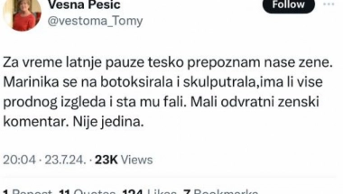 - Za vreme letnje pauze teško prepoznajem naše žene. Marinika se nabotoksirala i skulputrala, ima li više prirodnog izgleda i šta mu fali. Mali, odvratni ženski komentar. Nije jedina - navela je.