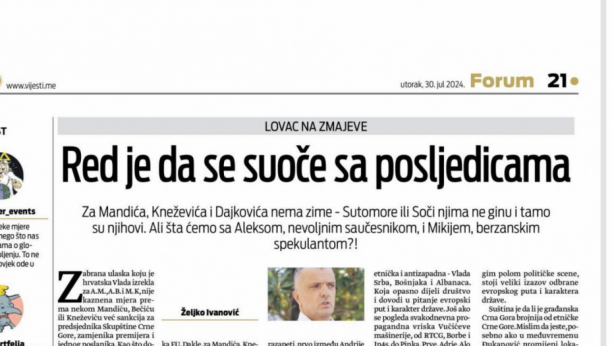 UŽAS Ivanović likuje zbog odluke Hrvatske da crnogorskim Srbima zabrani ulazak