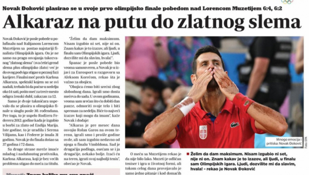 "Alkaraz na putu do zlatnog slema", što bi se reklo, sva četiri grend slema plus osvojeno olimpijsko zlato, pojavio se na stranicama tabloida u dvobroju za subotu i nedelju, pred finale teniskog nadmetanja na OI u Parizu.