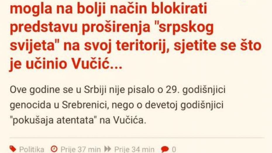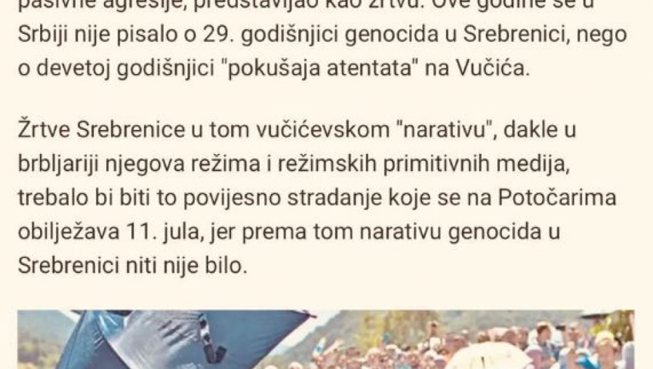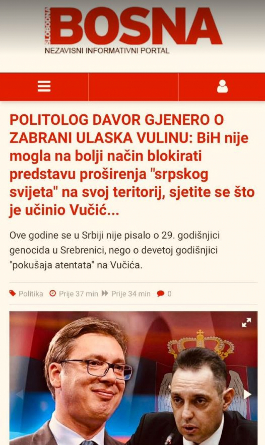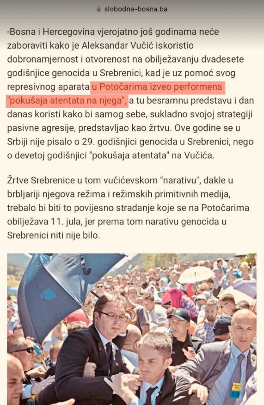 U tekstu pod naslovom "POLITIKOLOG DAVOR GJENERO O ZABRANI ULASKA VULINU: BiH nije mogla na bolji način blokirati predstavu proširenja "srpskog sveta" na svojoj teritoriji, setite se šta je učinio Vučić...", tvrdi se da je Vučić sam organizovao pokušaj atentata na njega u Potočarama.