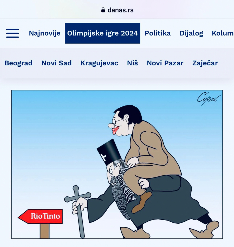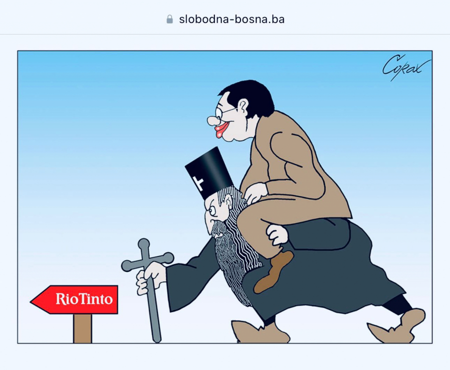 Ova gnusna karikatura, izgleda da jasno pokazuje da su se opozicija u Srbiji, Šolak i bosanski ekstremisti ujedinili u ostvarenju zajedničkog cilja: po svaku cenu sprečiti Srbiju da korišćenjem litijuma doživi ekonomski procvat posle kog više niko iz regiona ne bi mogao da je stigne.