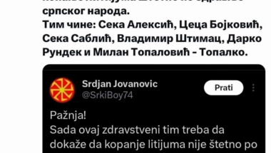 - Pažnja! I opozicija je formirala svoj zdravstveni tim koji će da dokaže da je kopanje litijuma štetno po zdravlje srpskog naroda. Tim čine: Seka Aleksić, Ceca Bojković, Seka Sablić, Vladimir Štimac, Darko RUndek i Milan Topalović-Topalko - napisao je ovaj Tviteraš.