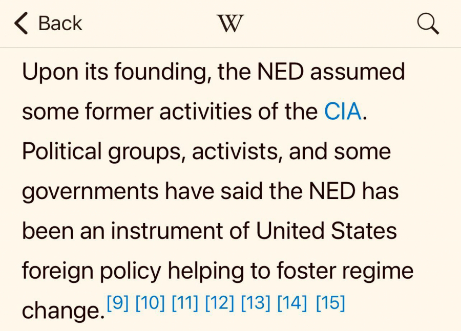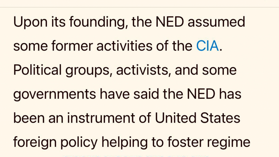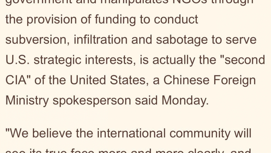 Da takozvani Nacionalni fond za demokratiju (NED - The National Endowment for Democracy) nije nikakva NVO, već organizacija koju neformalno zovu "druga CIA" i koju finansira Kongres SAD, nedavno je detaljno raskirinkano u zvaničnom izveštaju Ministarstvo spoljnih poslova Narodne Republike Kine.