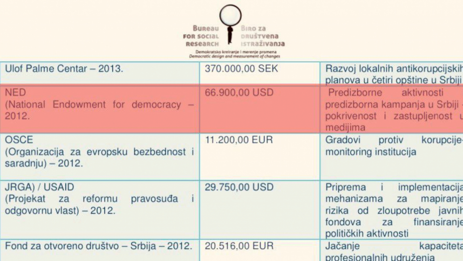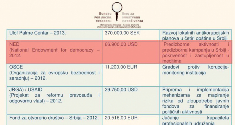 Na platnom spisku NED-a u Srbiji je, između ostalih, kako deluje i organizacija BIRODI, koja je danas podnela prijavu REM-u protiv TV Prva jer se ta televizija jutros bavila NED-om i dokumentom Ministarstva spoljnih poslova Kine u kom je navedeno da je NED finansirao rušenje vlasti u Srbiji.