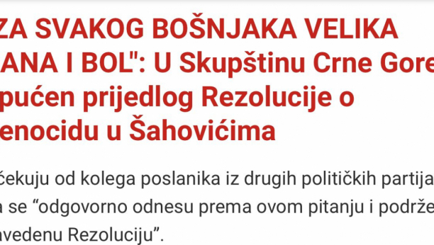 Kako su naveli, Predlog Rezolucije o genocidu u Šahovićima, iniciran je od strane Odbora za obeležavanje stogodišnjice genocida u Šahovićima, na čijem su čelu reis Islamske zajednice u Crnoj Gori, Rifat ef. Fejzić predsednik i akademik Šerbo Rastoder, potpredsednik.