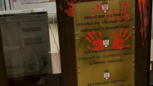 Tokom protesta opozicije u Novom Sadu, grupa demonstranata se okupila ispred zgrade suda i izvršila vandalizam, polivajući zgradu farbom.