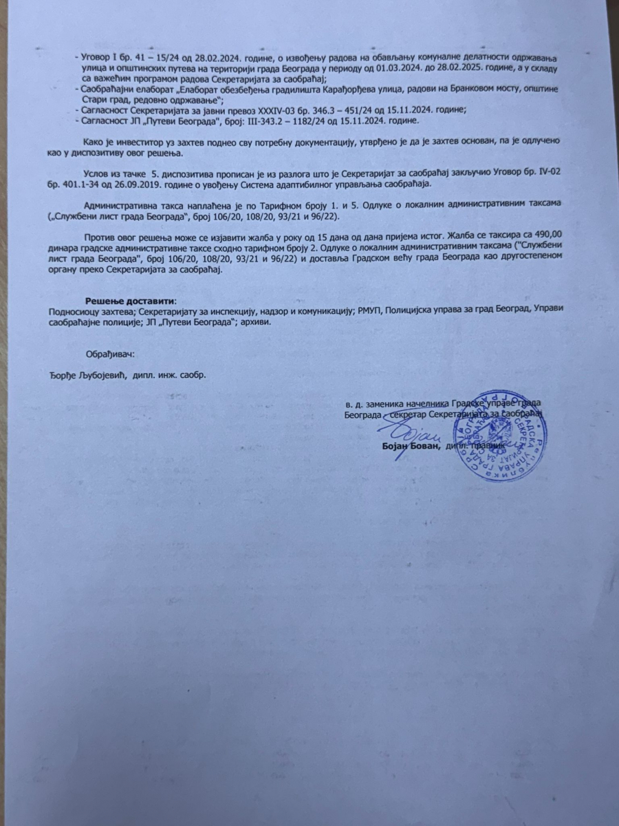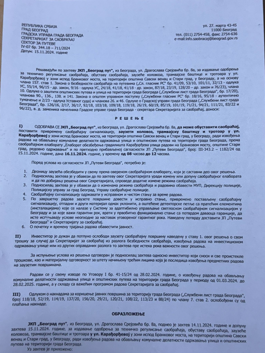 JKP „Beograd put” juče je najavio radove na Brankovom mostu koji se odnose na uklanjanje dotrajale olučne veze sklone padu u Karađorđevoj ulici i čišćenje slivničkih veza, te je shodno tome Sekretarijat za javni prevoz najavio privremeno zauzeće kolovoza danas od 8 do 12 sati. Tako je na sajtu Grada Beograda objavljena privremena promena rada tramvajskih linija 2 i 11.