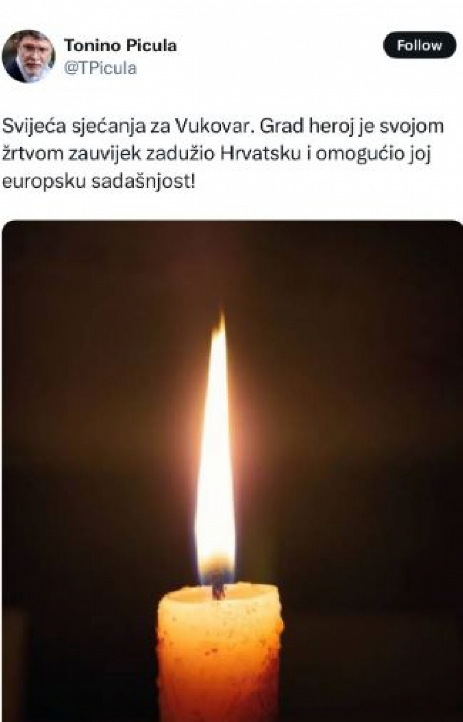 - Sveća sećanja za Vukovar. Grad heroj je svojom žrtvom zauvek zadužio Hrvatsku i omogućio joj evropsku sadašnjost - naveo je Picula u objavi.