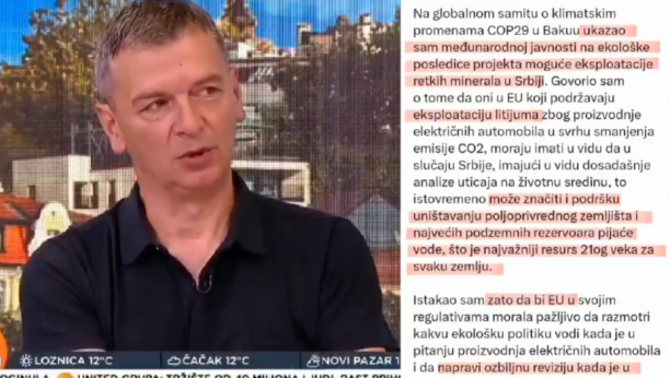 Boris Tadić: "Na globalnom samitu o klimatskim promenama COP29 u Bakuu ukazao sam međunarodnoj javnosti na ekološke posledice projekta moguće eksploatacije retkih minerala u Srbiji. Eksploatacija litijuma može značiti i podršku uništavanju poljoprivrednog zemljišta i najvećih podzemnih rezervoara pijaće vode, što je najvažniji resurs 21. veka za svaku zemlju. Zato bi EU morala da napravi ozbiljnu reviziju kada je u pitanju projekat eksploatacije litijuma u Srbiji."