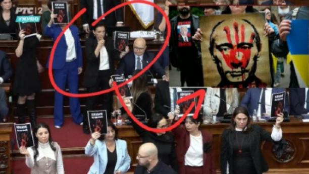 U pitanju su transparenti sa krvavom šakom i sloganom "Putin ubica", što je slična parola koju je i opozicija danas u Skupštini izgovarala - "ubice"!