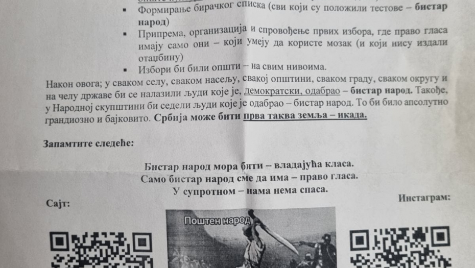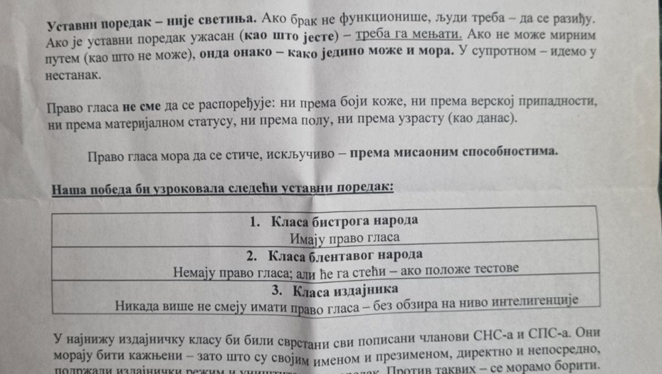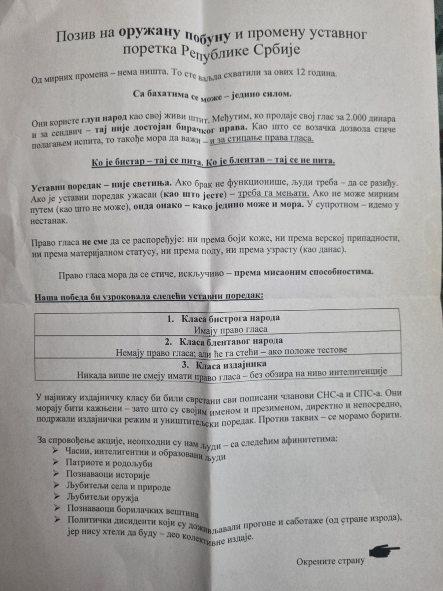 Pomenuti pamflet nosi naziv "Poziv na oružanu pobunu i promenu ustavnog poretka Republike Srbije" i u njemu se navodi kojim građanima RS bi trebalo uskratiti ustavom zagarantovano biračko pravo, koji su afiniteti građanima potrebni za sprovođenje navedene akcije, te se nabrajaju faze u realizaciji navedenog cilja.