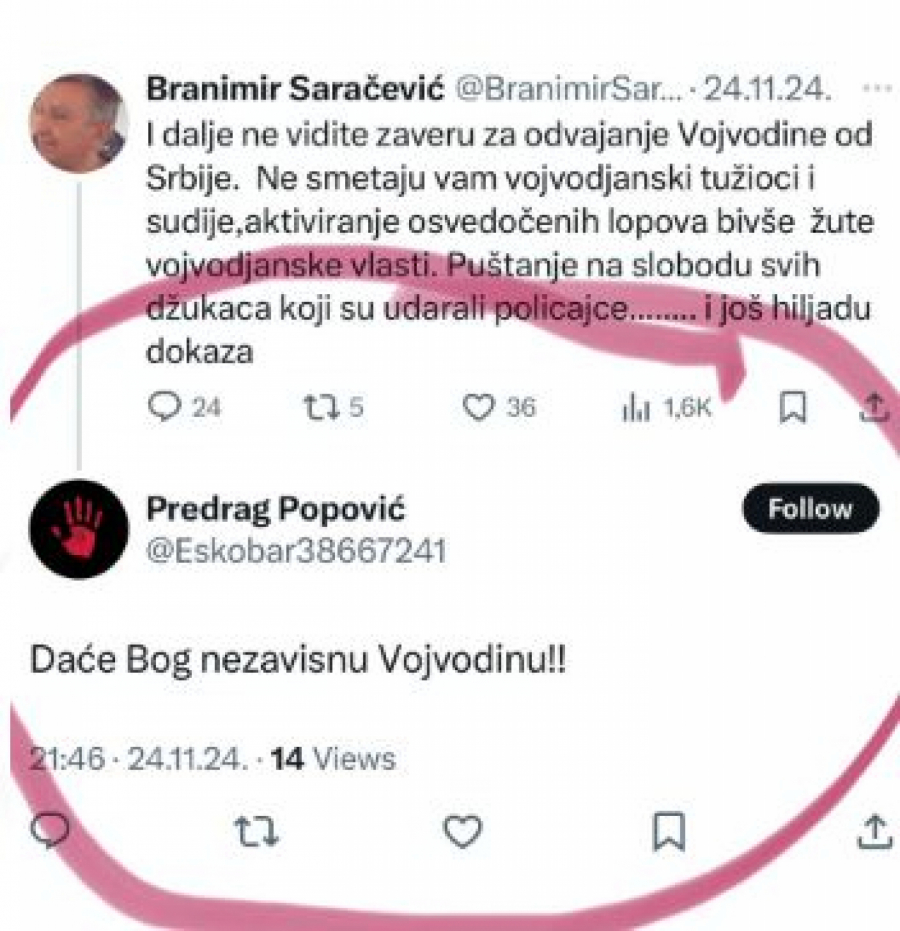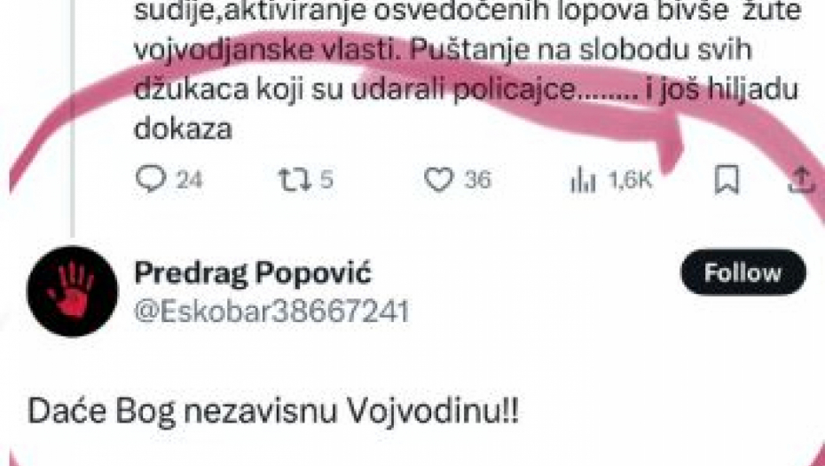 "Daće Bog nezavisnu Vojvodinu", poruka je koju je objavio jedan od sledbenika separatista iz redova anti-srpske opozicije.