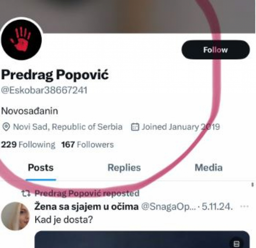 Kako se vidi na profilu korisnika koji je objavio tu poruku, vidi se da ističe i simbol kojim se ruši Srbija, a koji anti-srpska opozicija koristi tokom nasilnih protesta.