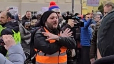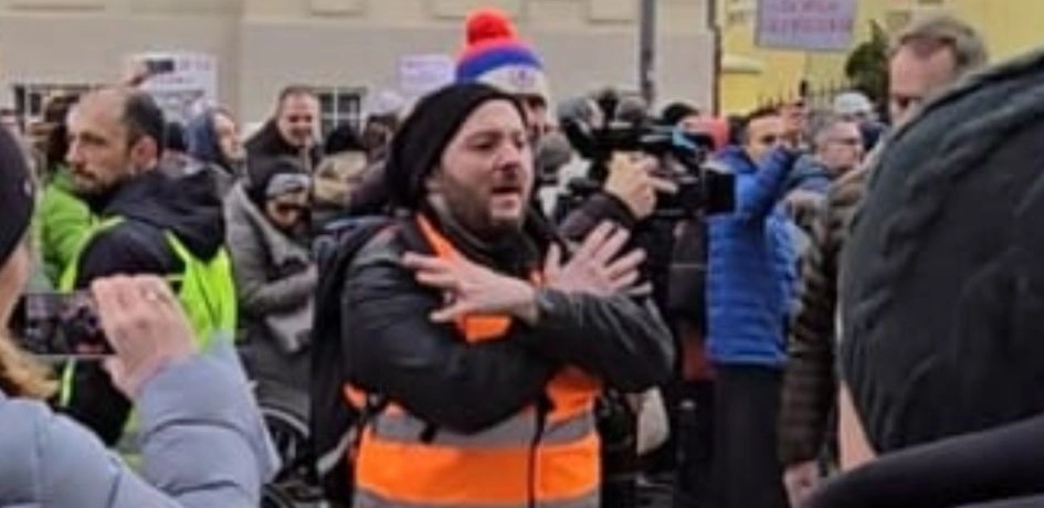 Skandal na protestu u Novom Sadu! Jedan od redara na protestu u Novom Sadu pokazuje dvoglavog orla, dobro poznati simbol velike Albanije.