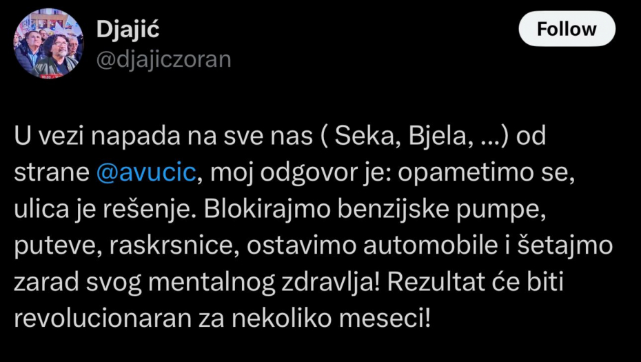 Đajić je 4. februara 2019. posredstvom društvene mreže Tviter javno „obavestio“ predsednika Republike Srbije da mu je izrečena kazna „doživotnog zatvora po Ustavu i svim pozitivnim zakonima“, da je izgubio sva građanska prava i „ovlastio“ građane svih 29 regiona u Republici Srbiji da istig liše slobode i predaju „narodnom sudu“, čime je evidentno pozvao na linč najvišeg predstavnika državne vlasti.