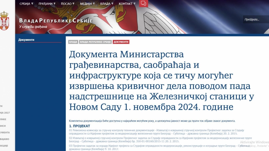 Vlada Srbije je juče počela da objavljuje dokumenta Ministarstva građevinarstva, saobraćaja i infrastrukture koja se tiču mogućeg izvršenja krivičnog dela povodom pada nadstrešnice na Železničkoj stanici u Novom Sadu, a prvog dana objavljeno je 128 dokumenata.