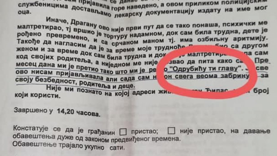 Inače, Draganu ovo nije prvi put da se tako ponaša, psihički me maltretirao, tj. vršio je torturu nada mnom, dok sam bila trudna, dete je rođeno prevremeno, i sa srčanom manom, tj. ima ozbiljnu aritmiju. Takođe, da naglasim da je za vreme moje trudnoće Dragan bio sa drugom ženom i za sve vreme dok sam bila trudna i dok me je maltretirao bila sam kod svojih roditelja, a nijednom me nije pozvao da pita kako sam. Pre mesec dana mi je pretio tako što mi je rekao: "Odrubiću ti glavu!". Ja sve ovo nisam prijavljivala, ali sada sam nakon svega veoma zabrinuta za svoju bezbednost, roditelja i dece.