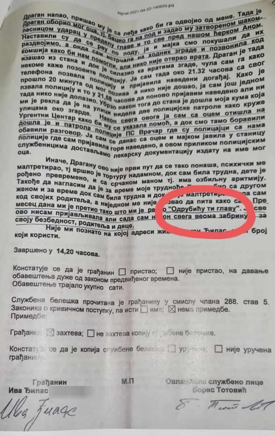 Nakon svega ovoga, ja sam sa ocem otišla na Urgentni centar kako bi mu se ukazala pomoć, a dok smo boravili tamo došla je patrola PS Vračar, gde su policajci sa nama obavili razgovor. Ja sam se danas sa ocem i majkom javila u stanicu policije gde sam prijavila gore navedeno, a ovom prilikom policijskim službenicima dostavljamo lekarsku dokumentaciju izdatu na ime mog oca.