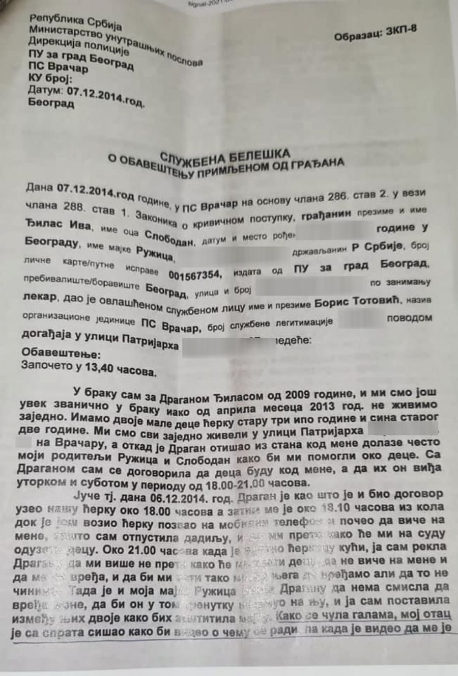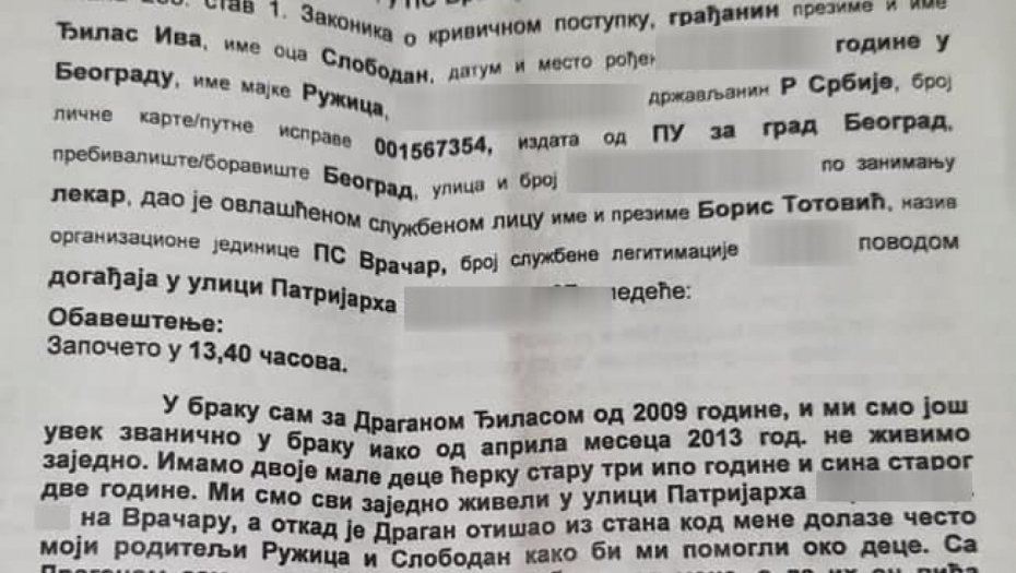 Podsetimo, u javnost izašla policijska službena beleška sačinjena 7. decembra 2014. godine, u kojoj Iva Đilas, tada još zakonita supruga Dragana Đilasa, prijavljuje da je on dan ranije, 6. decembra, kako se su sumnja upao u stan u kojem je živela sa decom, nasrnuo na njenu majku Ružicu, napao njenog oca Slobodana, oborio ga na pod i tukao pesnicama, a njoj najstrašnije zapretio!?!