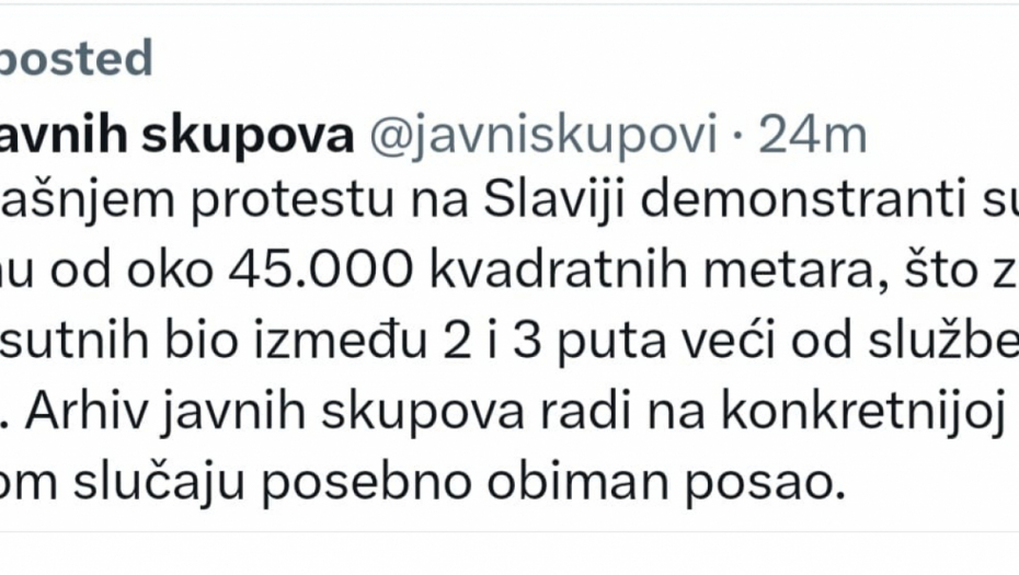 Ranije, novinarka antisrpske televizije Žaklina Tatalović napisala je na društvenoj mreži X da je 100.000 ljudi bilo na Slaviji danas, na šta je reagovao narodni poslanik Milenko Jovanov: