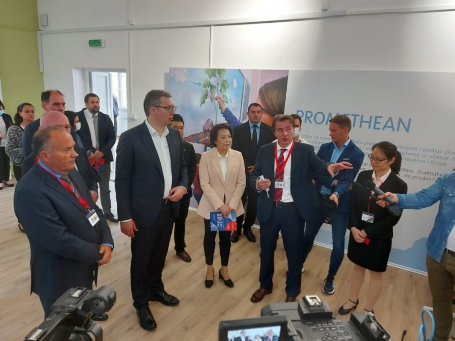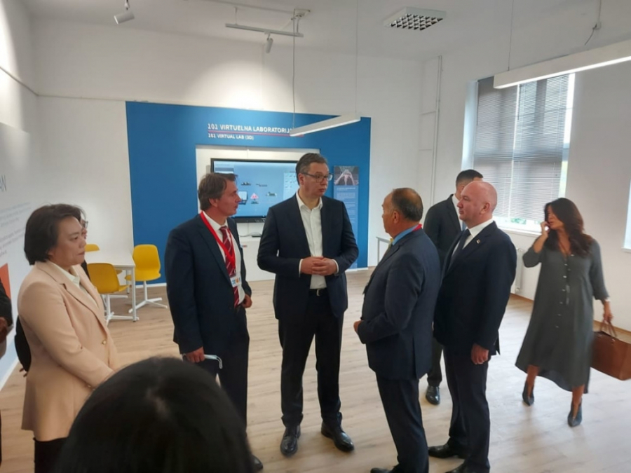 Uz predsednika Vučića izložbeni prostor posetili su i ministar prosvete Mladen Šarčević, ministar za inovacije i tehnološki razvoj Nenad Popović i ambasadorka Kine u Srbiji Čen Bo.