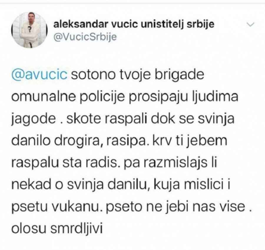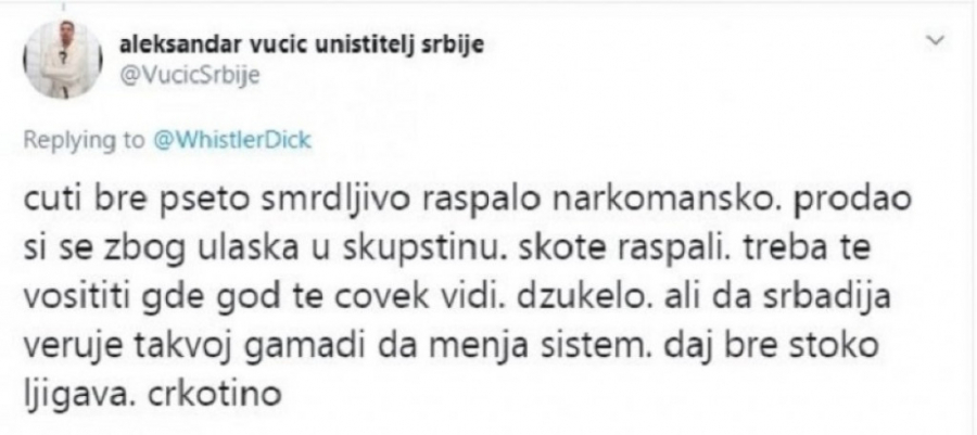 Pogledajte bolesni tvit sa izmišljenog profila i recite sami - da li je moguće da neko ko ovo napiše već nije u odgovarajućoj ustanovi?!