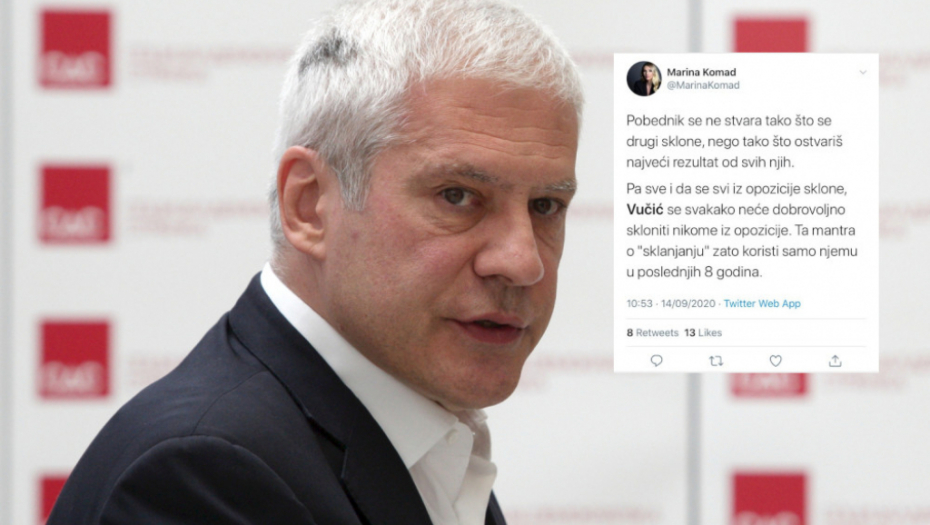 Pa sve i da se svi iz opozicije sklone, Vučić se svakako neće dobrovoljno skloniti nikome iz opozicije. Ta mantra o sklanjanju zato koristi samo njemu u poslednjih osam godina", napisala je Marina Komad na Tviteru, ali je svima jasno da to iz nje govori njen šef Boris Tadić.