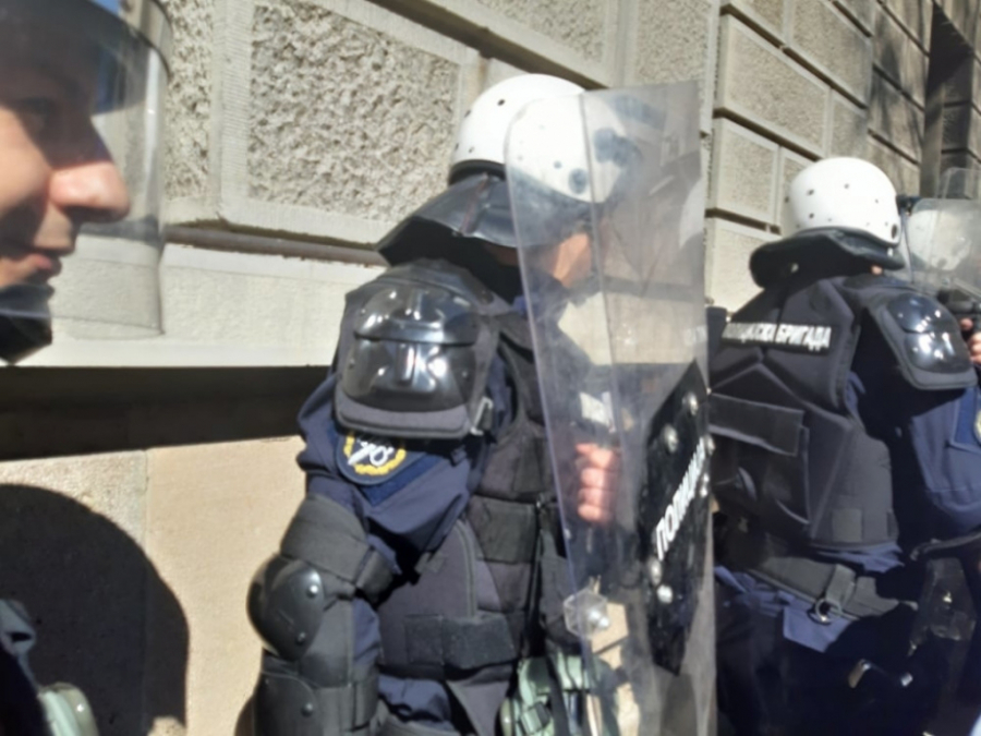 Pripadnici policije mirno stoje i štitom zaklanjaju lica od napada građana od kojih su neki u vidno alkoholisanom stanju.