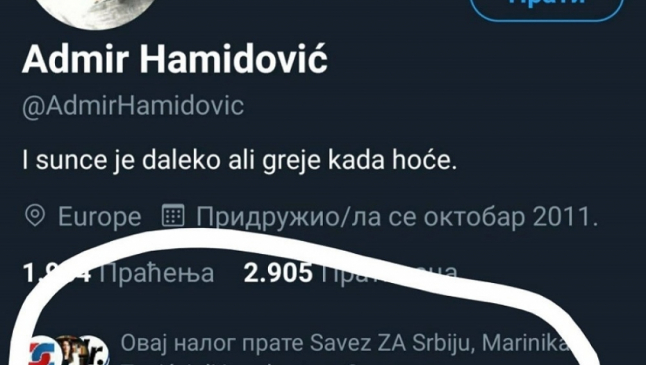 Tviteraš Admir Hamidović koji je na ovoj društvenoj mreži ponižavao srpske žrtve etničkog čišćenja u hrvatskoj zločinačkoj akciji "Oluja", a potom pljuvao i po zastavi Srbije, obratio nam se, preteći tužbom, zbog objavljivanja njegovog identiteta i ukazivanja na njegove aktivnosti.