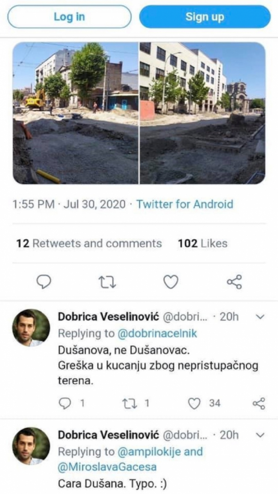 - Izašli smo na teren u Dušanovcu ulicu, a po prijavi @MiroslavaGacesa da je gradilište prazno. Zatekli smo samo par radnika, a osećaj je da se radi dosta stihijski i u malom obimu za ovako važnu saobraćajnicu, za koju su odvojeni milioni evra iz kredita - objavio je Veselinović na Tviteru.