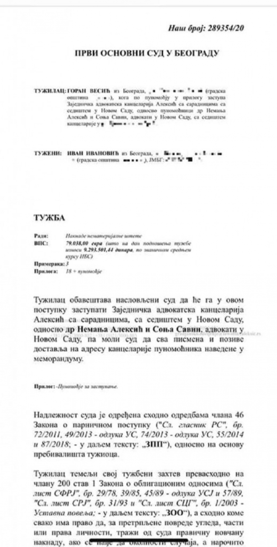 "Danas sam podneo tužbu protiv Ivana Ivanovića, uličara iz Beograda, zbog laži koje je izneo o mom letovanju.