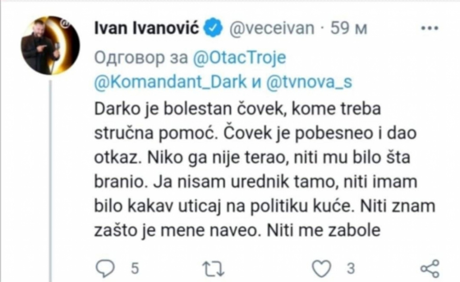 Voditelj Ivan Ivanović nazvao je svog dojučerašnjeg kolegu Darka Mitrovića Dareta bolesnikom kome je potrebna pomoć nakon što je voditelj "Mentalnog razgibavanja" pompezno dao otkaz usred programa.