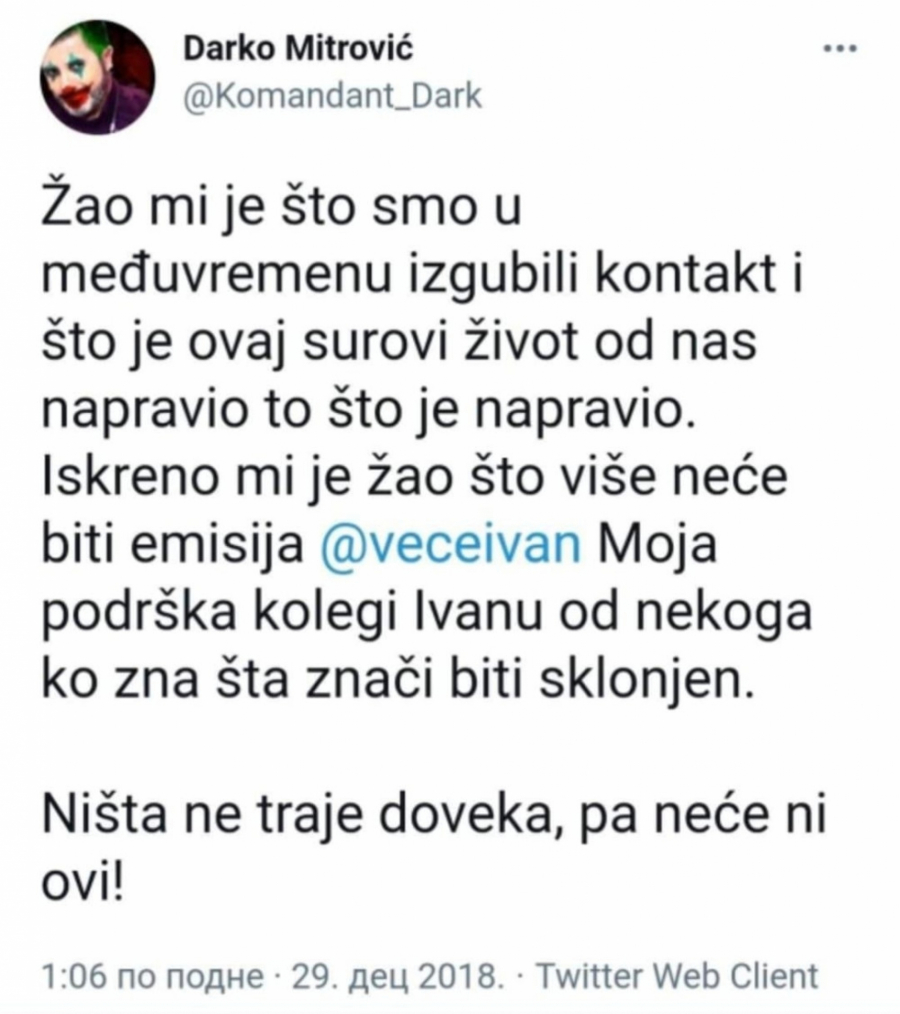 Ivanović je na ovaj način pokazao i kakav odnos ima prema svojim najbližim saradnicima, ali i onima koji su ga podržavali. Mitrović je, naime, podržao Ivanovića kada je, na isto tako teatralan način, otišao sa TV Prva izigravajući žrtvu nekakve cenzure pod pritiskom vlasti u Srbiji. Ivanović je tada, uveliko sebi obezbedio novi, dobro plaćen posao na Novoj, ali je bilo potrebno podići sebi cenu i predstaviti se kao žrtva političkog progona, dok su se zapravo punili džepovi kod novih gazda koji drže pomenuti medij i kojima ovaj zabavljač verno služi u političkoj kampanji.