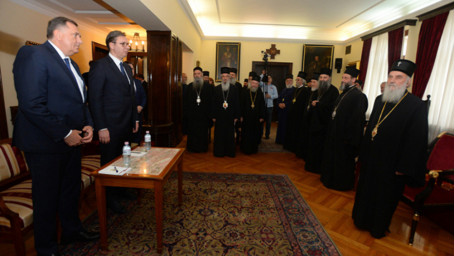 - Razgovarali smo dva i po sata. Situacija je teška. Otvoreno smo diskutovali i pokušavamo da napravimo jedan racionalan odnos u budućnosti. Govorio sam iskreno i otvoreno o onome što tišti naš narod i čini mi se da smo se dobro razumeli, i da svi radimo u interesu naše otadžbine Srbije. Govorili smo i o odnosu Republike Srbije i Sprske, o našem memorijalnom centru Jasenovcu. Posle otovrene diskusije sa pojedinim episkopima, ja sam govorio istinu, iskreno, otvoreno, i rekao da nekada nismo bili u saglasju sa realnošću i da nas je to skupo koštalo. Ne bih voleo da nam se iste stvari dešavaju sada. Verujem u plodotvornost sastanka, mislim da je crkva važan činilac i da treba da je čujemo. Pred nama je težak period, ja sam izneo sve svoje brige. Mislim da je patrijarh odlično razumeo moju brigu, a neko mora da donosi teške ovozemaljske odluke. Jedan od vladika je rekao "šta god da uradiš Vučiću, bićeš kriv". Moje je da nastavimo da se borimo, da izvučemo maksimum iz svega što možemo da dobijemo, da čuvamo mir, stabilnost, ali da ne pristajemo na ucene. Hvala Njegovoj Svetosti i episkopima, kao i predsedniku Dodiku koji je dobro razumeo državnu poziciju Srbije. Nastavićemo da radimo u najboljem interesu naše zemlje - rekao je Vučić.