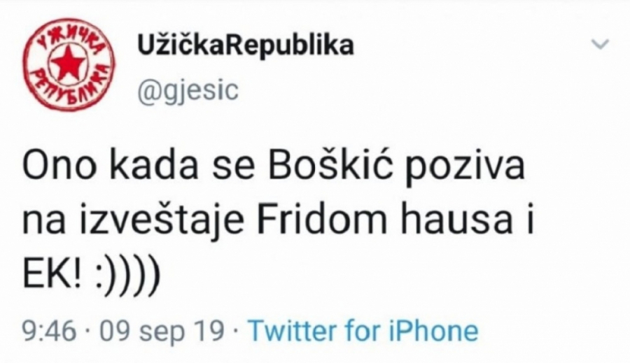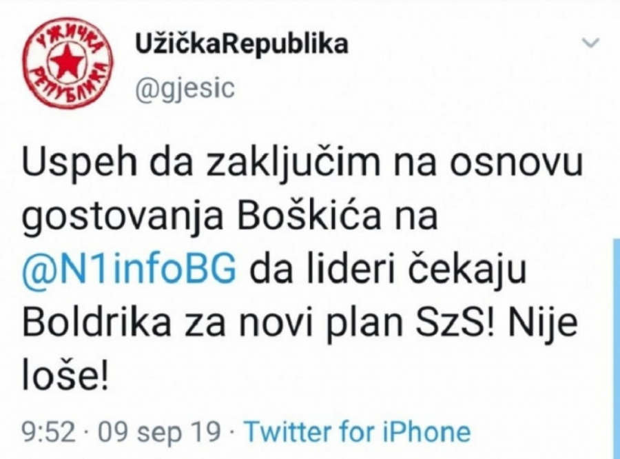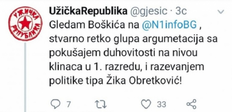 Funkcionera Demokratske stranke Gorana Ješića opasno je iznervirao nastup lidera Đilasovog Saveza za Srbiju Boška Obradovića na TV N1, pa je na njega osuo drvlje i kamenje na Tviteru...