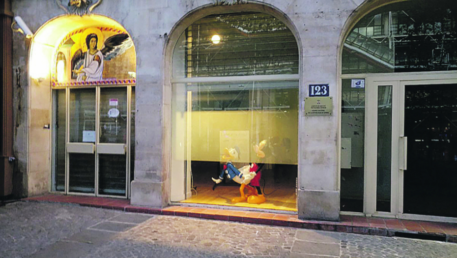 Reč je o skulpturi koja pokazuje Mikija Mausa i Paju Patka u seksualnom zanosu, a izložena je u izlogu. Da stvar bude skandaloznija, sporna skulptura je izložena tik ispod freske Belog anđela, koja je na samom ulazu!