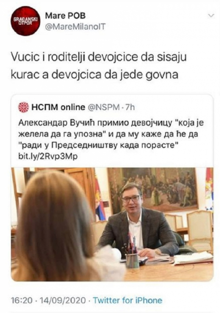 Istom uvredom se obratio i predsedniku Vučiću, a maloj devojčici je rekao da jede g**na!