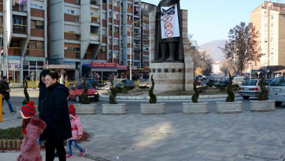 U centru severne Kosovske Mitrovice, na spomeniku kneza Lazara, okačena je parola "100 odsto taksi, nula odsto slobode!"